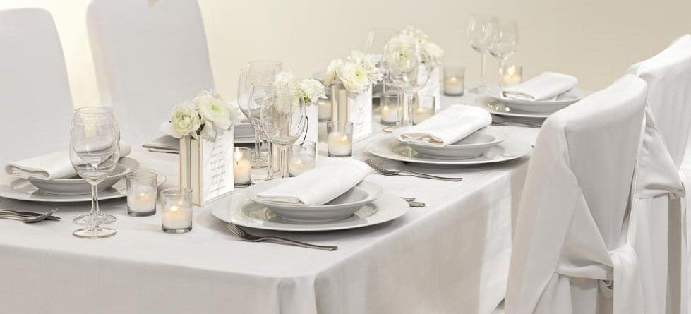 Egal wo gefeiert wird: Weißes Geschirr und weiße Tischdecken sind immer vorhanden und bieten die beste Basis für eine cleane, moderne Tischdekoration.