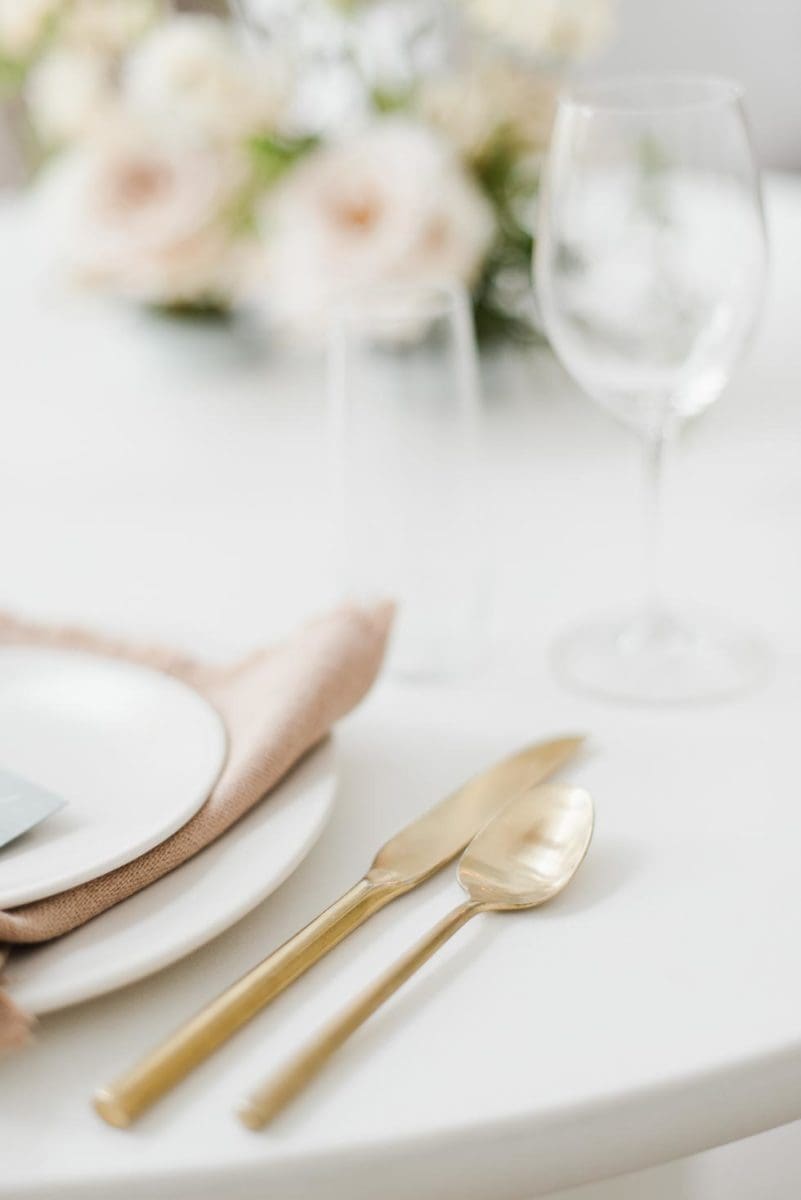 Besondere Akzente ergeben die goldenen Serviettenringe und das Besteck. Unser Tipp: Wer es noch festlicher mag, kann darüber hinasu noch die Blumenvase in Gold oder Silber ansprühen.