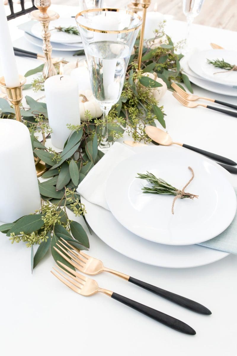 - Eine weiße Tischdecke mit grünen Zweigen, wie zum Beispiel Eukalyptus, Olivenzweigen oder Farn kombiniert