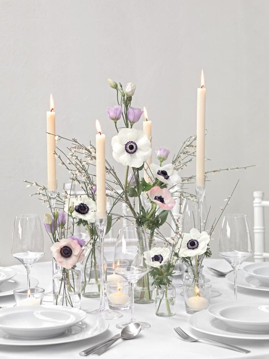 Für runde Tische werden die kleinen Blumenvasen dabei ganz einfach abwechselnd mit Teelichtern oder Stabkerzen im Zentrum des Tisches platziert und ergeben sogar mit wenigen Blütenstilen einen herrlich blumigen Akzent.