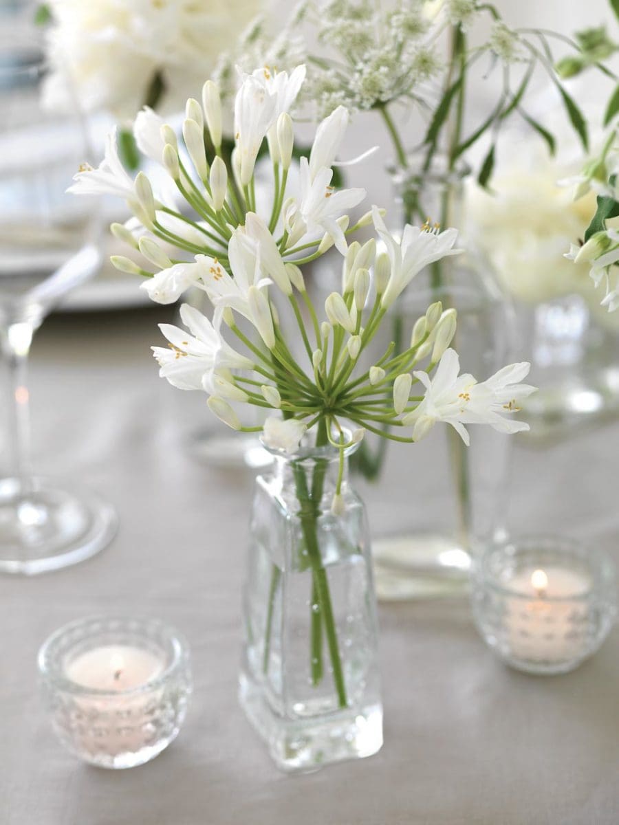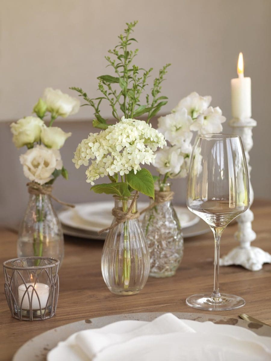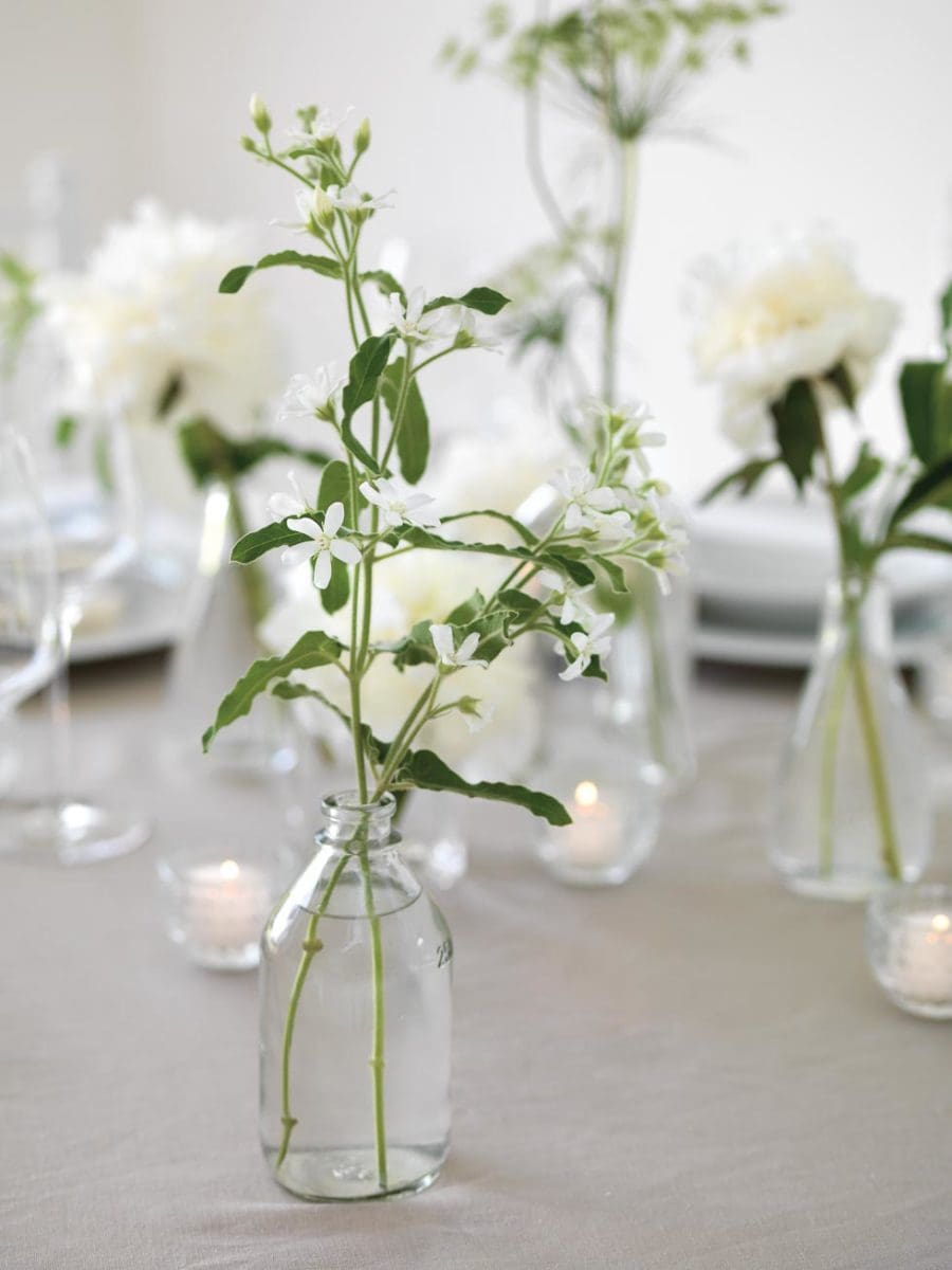 Mit einfachen Flaschenvasen und verschiedenen weißen Blumen könnt ihr im Handumdrehen eine stilvolle Tischdekoration gestalten.