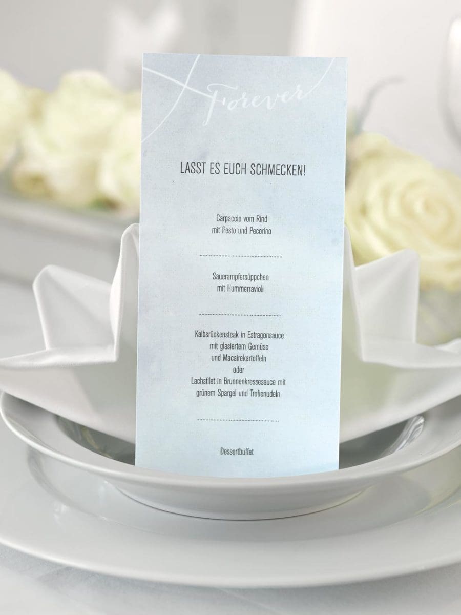 Schön ist auch, die Menükarten als Platzkarte individuell zu gestalten. Mit unseren Vorlagen kein Problem, denn damit könnt ihr so viele Karten downloaden wie ihr möchtet.