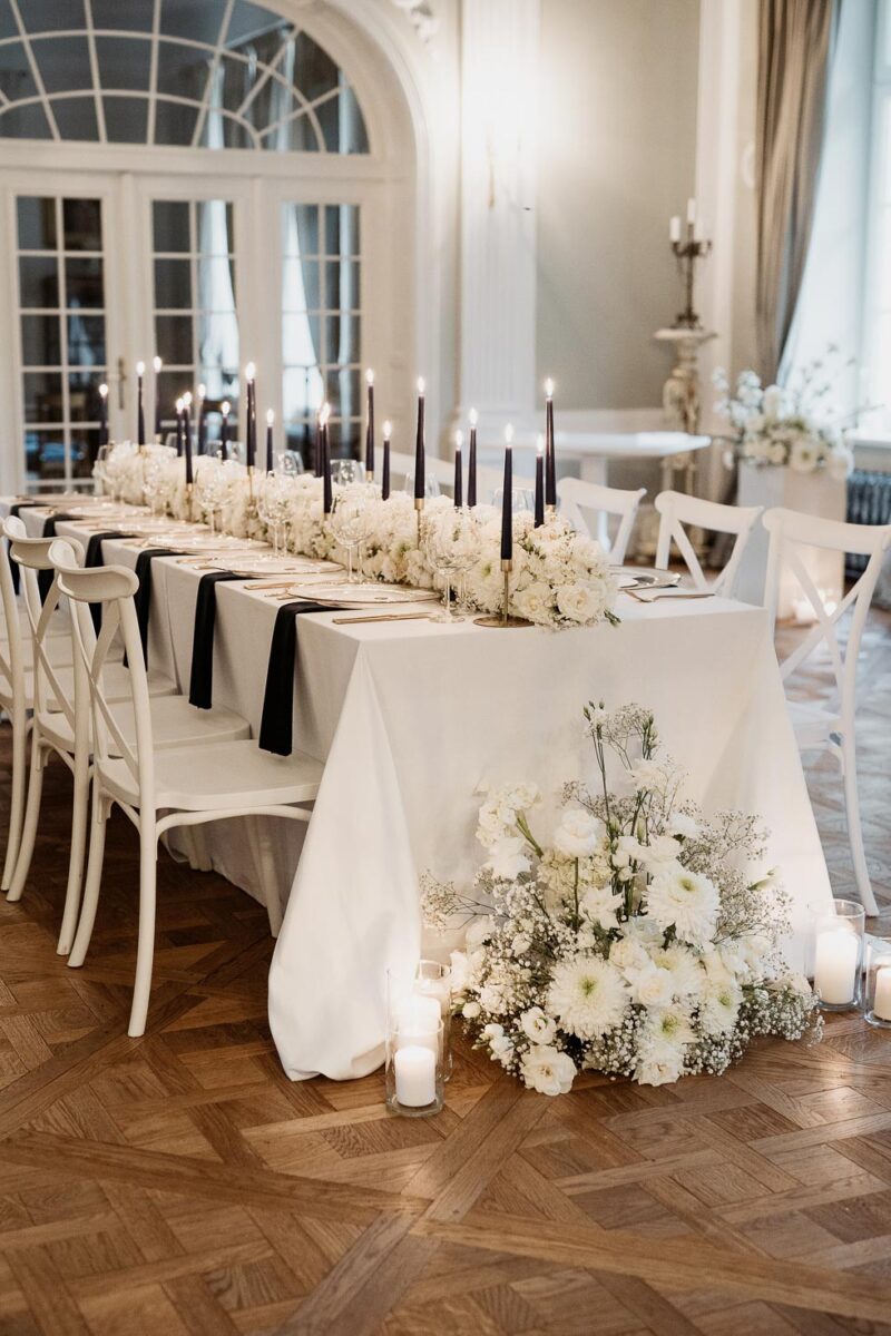 Besonders schön und abwechslungsreich könnt ihr weiße Blumen auch mit leicht abgetönten Tischdecken, Läufer oder Servietten gestalten und damit feine Kontraste schaffen.