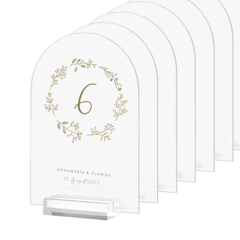 Lasst euch ganz individuelle Tischnummern mit Goldelementen in euren Hochzeitsfarben gestalten.