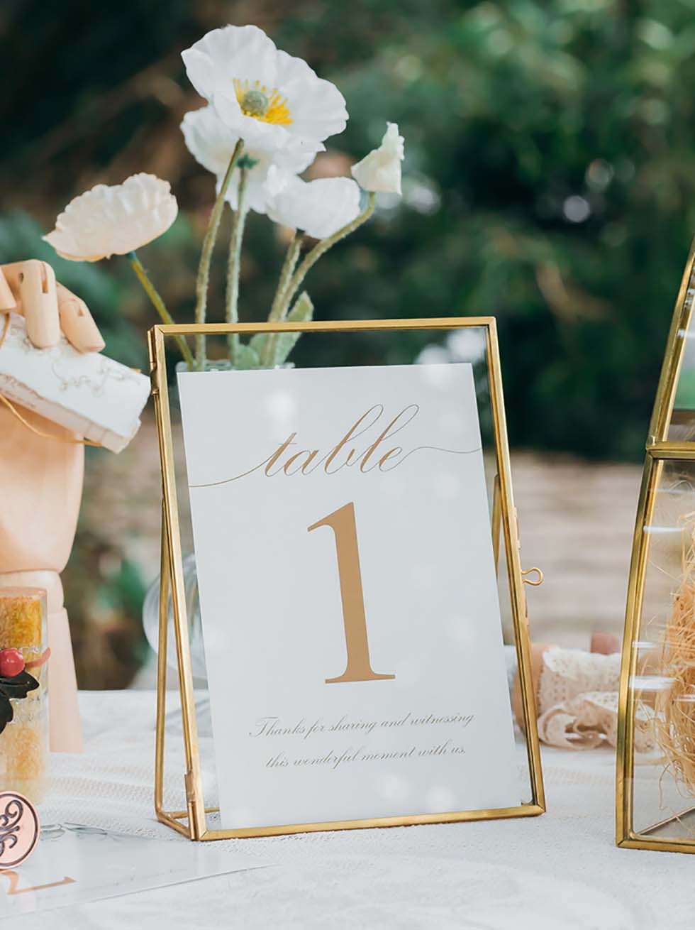 Erhaltet die Tischnummern als Aufsteller, die ihr ganz ohne Kartenhalter aufstellen könnt oder verwendet Rahmen oder Kartenhalter, um sie auf jeden Tisch zu stellen.