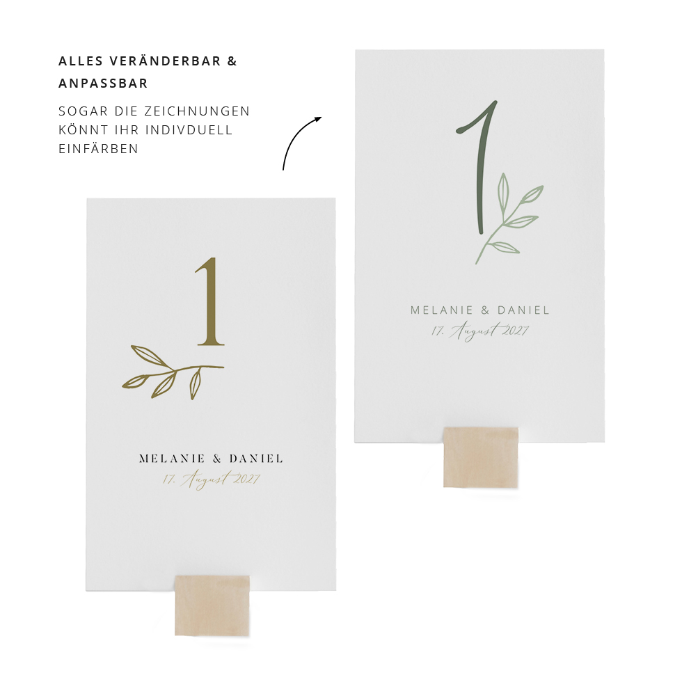 Personalisiert die Tischnummern Karten in unserem Online-Designer mit Schriften, Farben, Fotos oder Gestaltungselementen und passt sie ganz nach euren Wünschen an.
