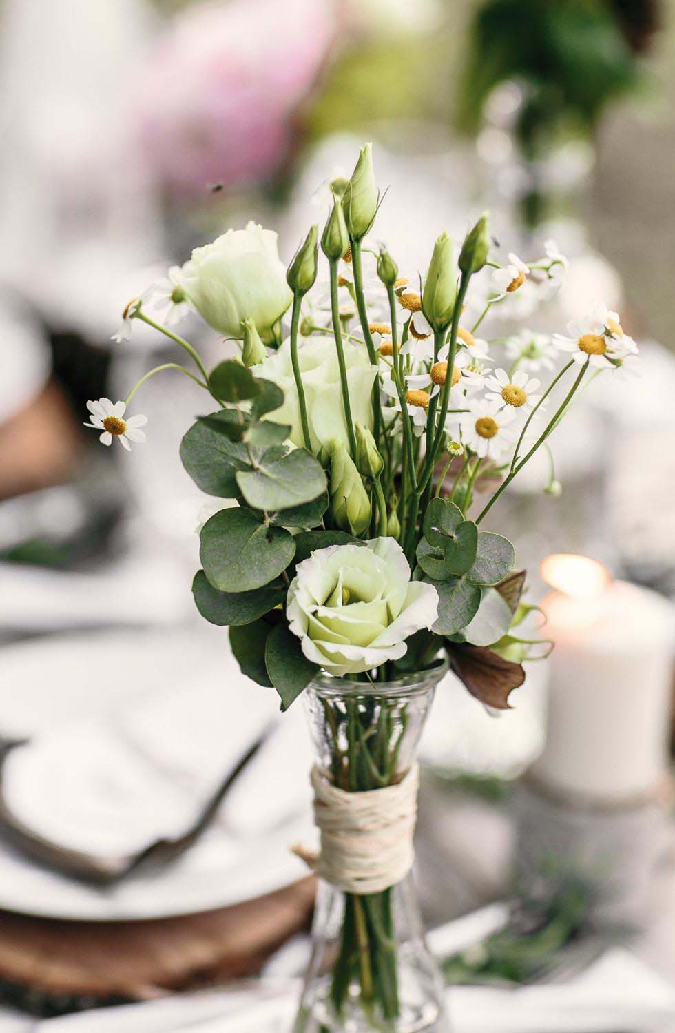 Wickelt ganz einfach eine Schnur um das Glas, damit es an den Bänken aufgehängt werden kann, und füllt es mit Wasser. Nachdem die Gläser an der Bank befestigt sind, füllt ihr sie mit Hortensien, typischen Wiesenblumen, Schleierkraut oder den Blüten, die ihr auch im Brautstrauß verwendet.