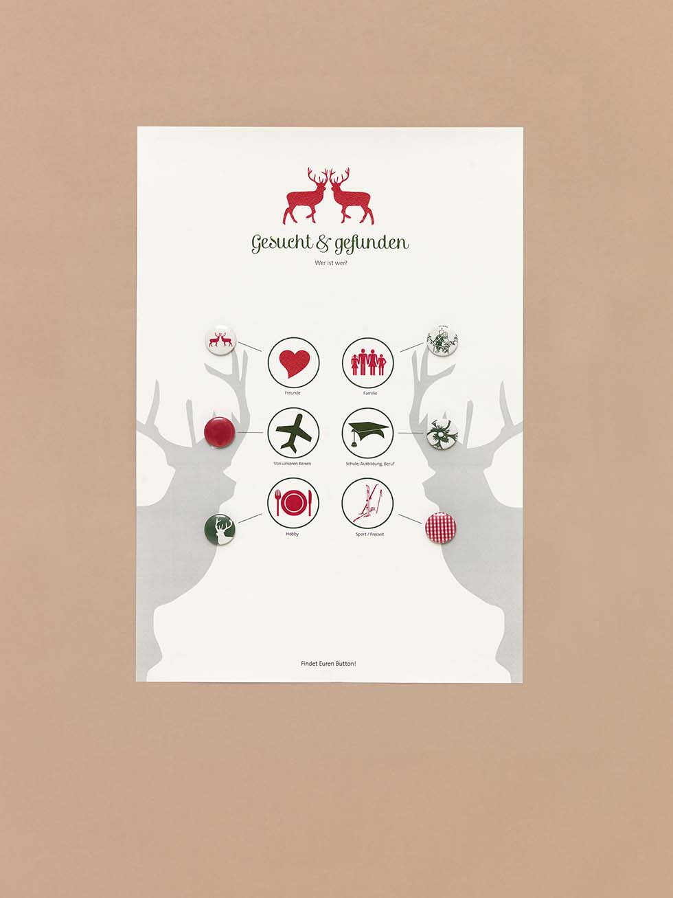 Damit euren Gästen das Kennenlernen untereinander gleich noch leichter fällt, besonders, wenn ihr eine große Trachtenhochzeit feiert, könnt ihr kleine Buttons basteln, die sich alle direkt anstecken können. Die Buttons könnt ihr dann beispielsweise an verschiedene Gruppen verteilen: Freunde, Familie, Hobby, Beruf und Schule. So kommen alle gleich ins Gespräch.