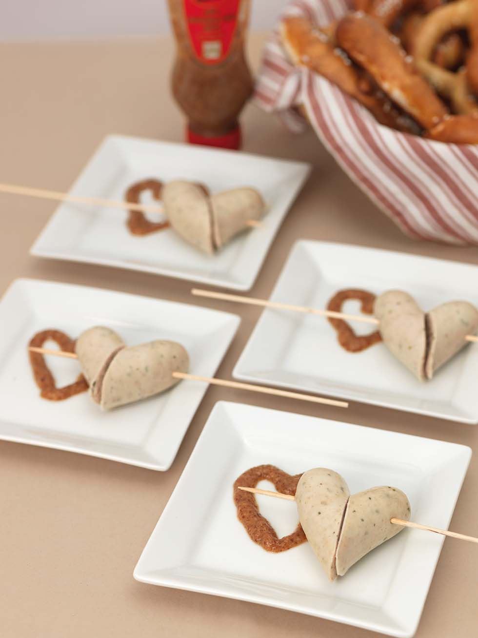 Schneidet dafür die Würste ganz einfach beim Servieren in der Mitte schräg durch, dreht die eine Hälfte einmal um und spießt sie auf. Schon habt ihr richtig geniale Herz-Würste.