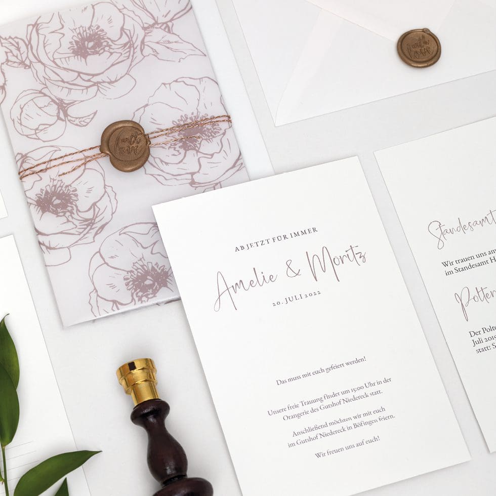 Wollt ihr fix und fertige Karten auf Transparentpapier drucken lassen, könnt ihr den weddingstyle Druckservice nutzen und sogar verschiedenste Elemente miteinander kombinieren.