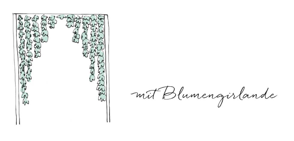 Entweder bestellt ihr beim Floristen ein Gesteck, dessen Basis Freuchtsteckmasse ist und bindet dieses ganz einfach an den Traubogen. Alternativ könnt ihr eine Girlande aus Ästen, Blättern und Blüten wie einen lang hängenden Strauß binden lassen, der kurz vor der Trauung am Bogen befestigt wird.