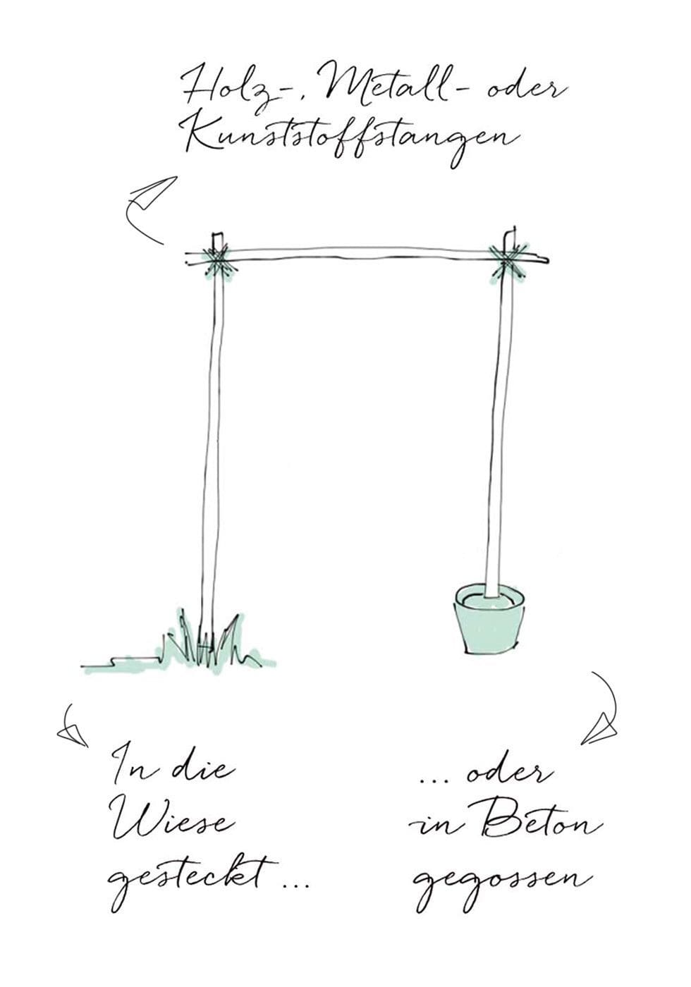 Dafür könnt ihr große Behälter (zum Beispiel dekorative Keramik-, Zink-, oder Holzbehälter) mit Beton füllen und darin jeweils einen Stab sicher befestigen.