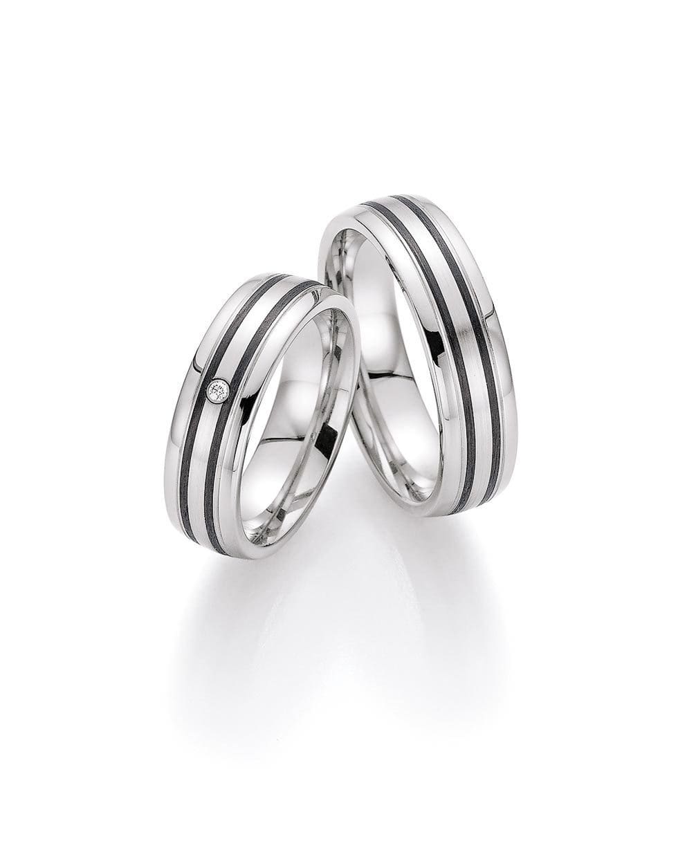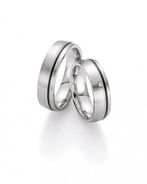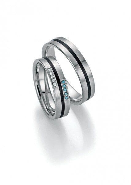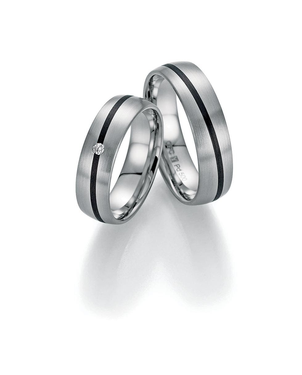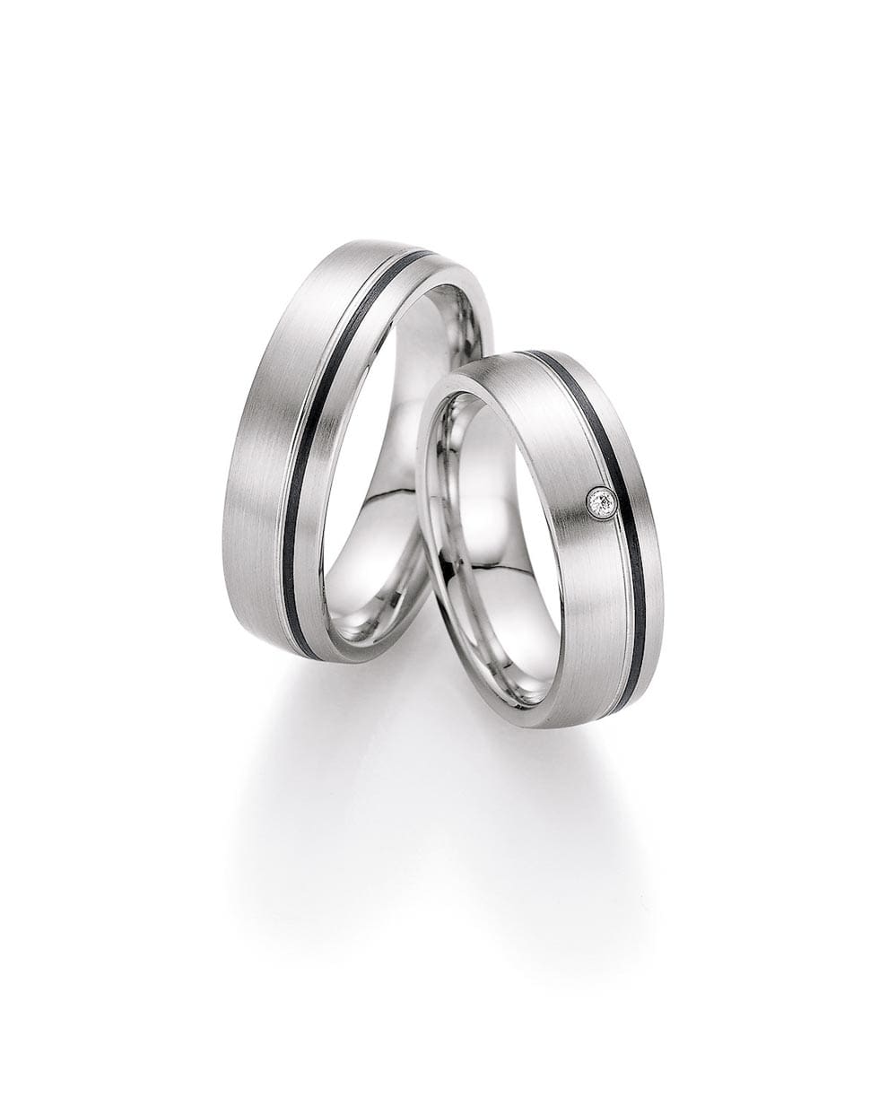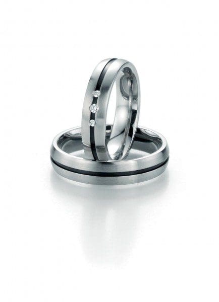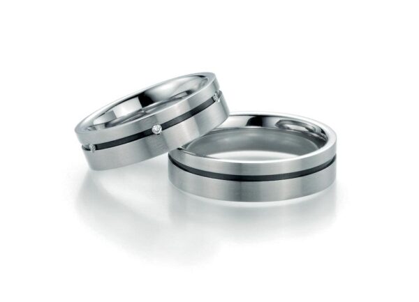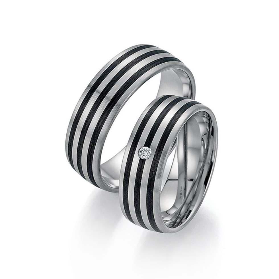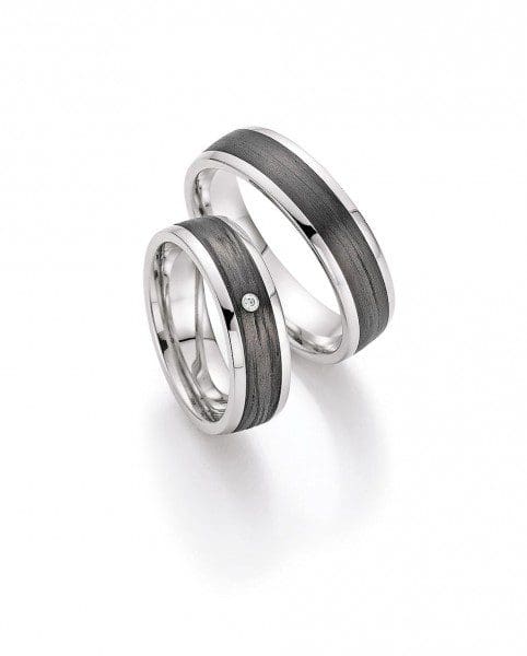 Wie ein markantes Tattoo wirkend lassen sich Trauringe mit Carbon auch wunderbar puristisch-modern gestalten. Hierbei erhalten die Trauringdesigns im Zusammenspiel mit hell strahlendem Palladium, Platin sowie Weißgold oder farblich dezenterem Edelstahl, Titan oder Graugold einen mehr oder weniger starken Hell-Dunkel-Kontrast.