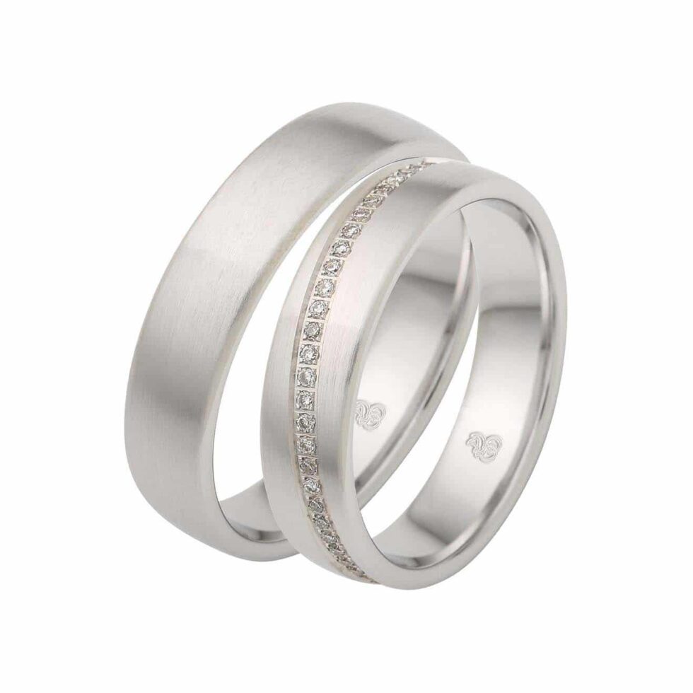 Diamanten sitzen in Trauringen aus Palladium dauerhaft absolut fest und der helle Farbton bringt das Funkeln der Brillanten noch mehr zum Strahlen.