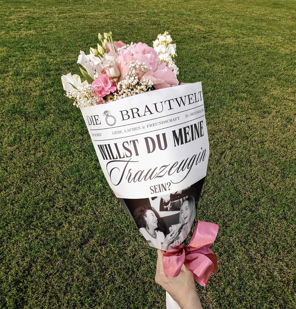 Eine herrlich kreative Idee, um eure Trauzeugin zu fragen, ist eine individuell gestaltete Zeitung, die ihr in DIN A3 druckt und überreicht oder als Wrapper für ein paar Blumen verwendet: