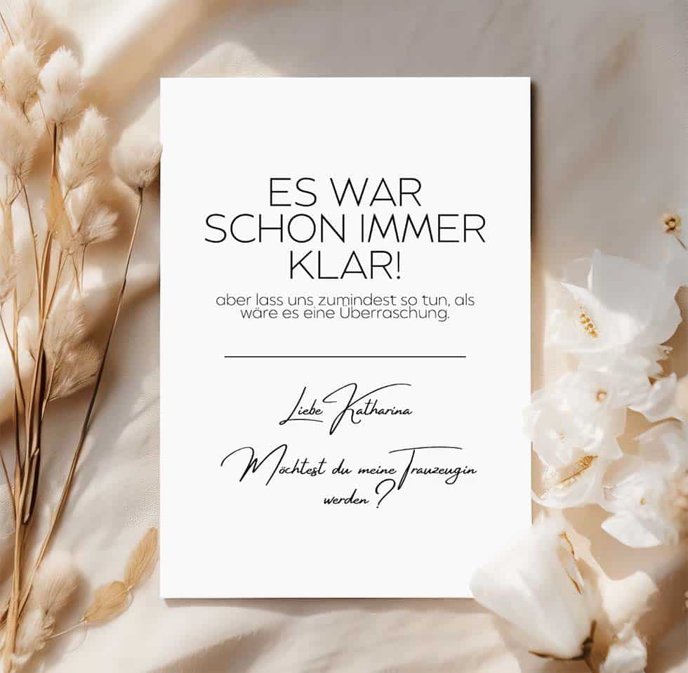 Auf der Vorderseite der Karte steht ein schöner Spruch oder ganz klassisch die Frage „Willst du meine Trauzeugin sein?“. Auf der Rückseite kannst Du ein paar persönliche Zeilen ergänzen.