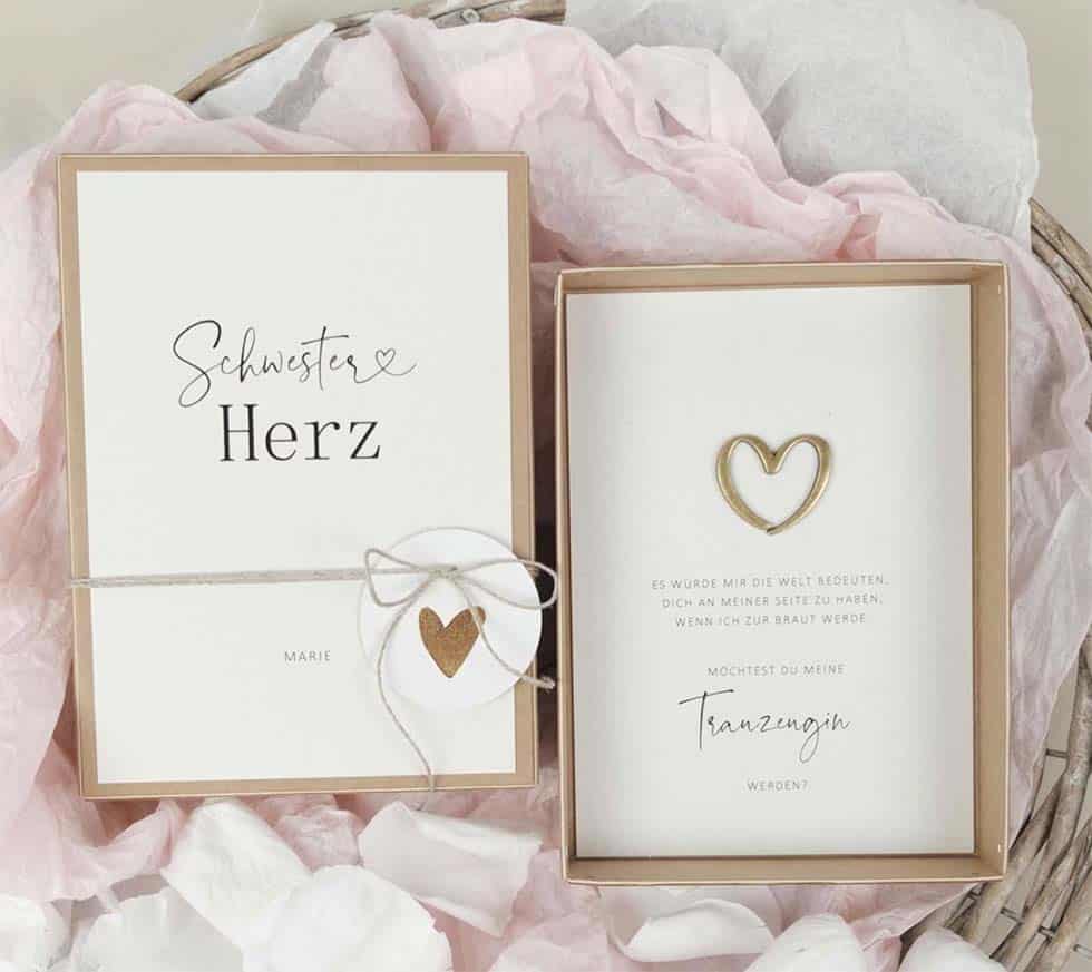 Wollt ihr eurer Trauzeugin mehr als "nur" eine Karte überreichen, sind auch kleine Boxen mit Karte und süßen Extras eine schöne Idee.