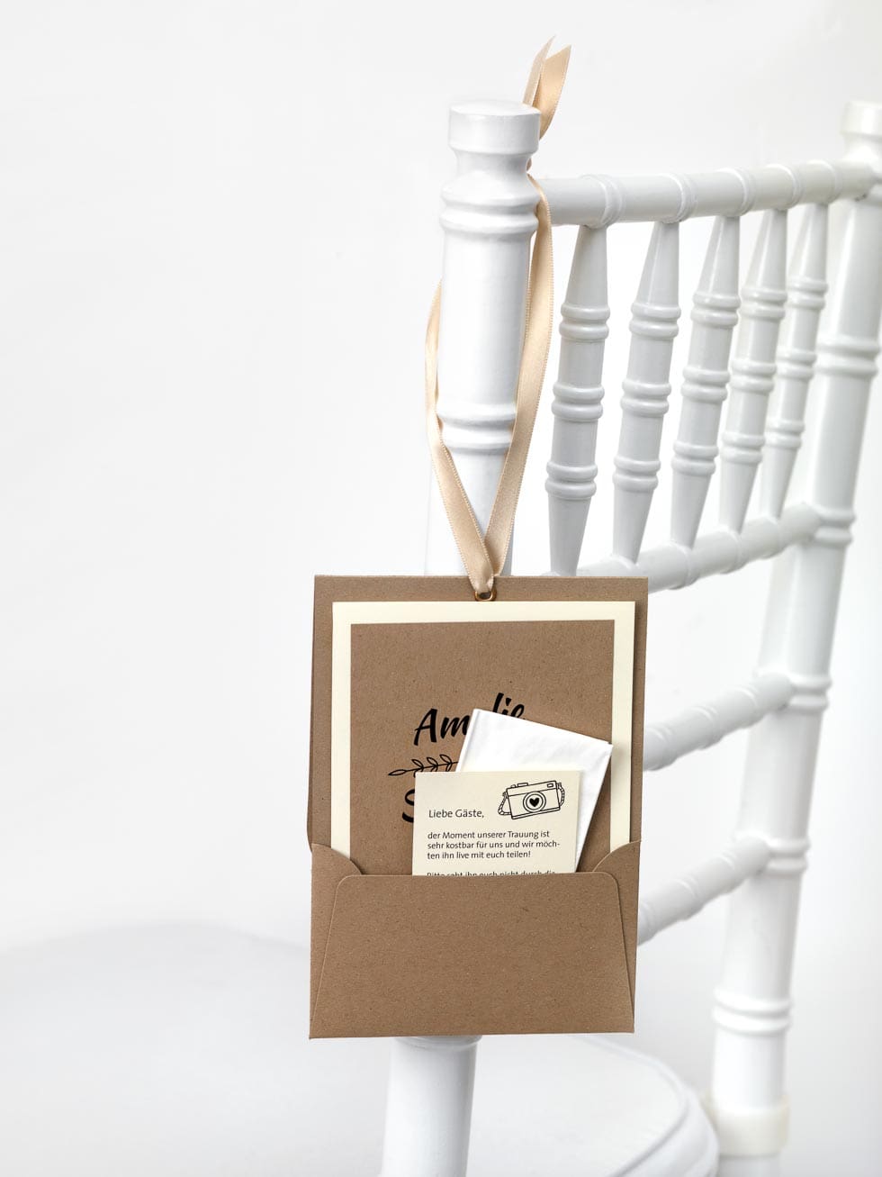 Eventuell möchtet ihr eure Gäste darauf hinweisen, dass sie keine Fotos eurer Hochzeit in Social Media Kanälen teilen dürfen. Denn eine Hochzeit ist ein Privatevent und es könnte passieren, dass es Gäste gibt, die das Teilen gar nicht mögen.