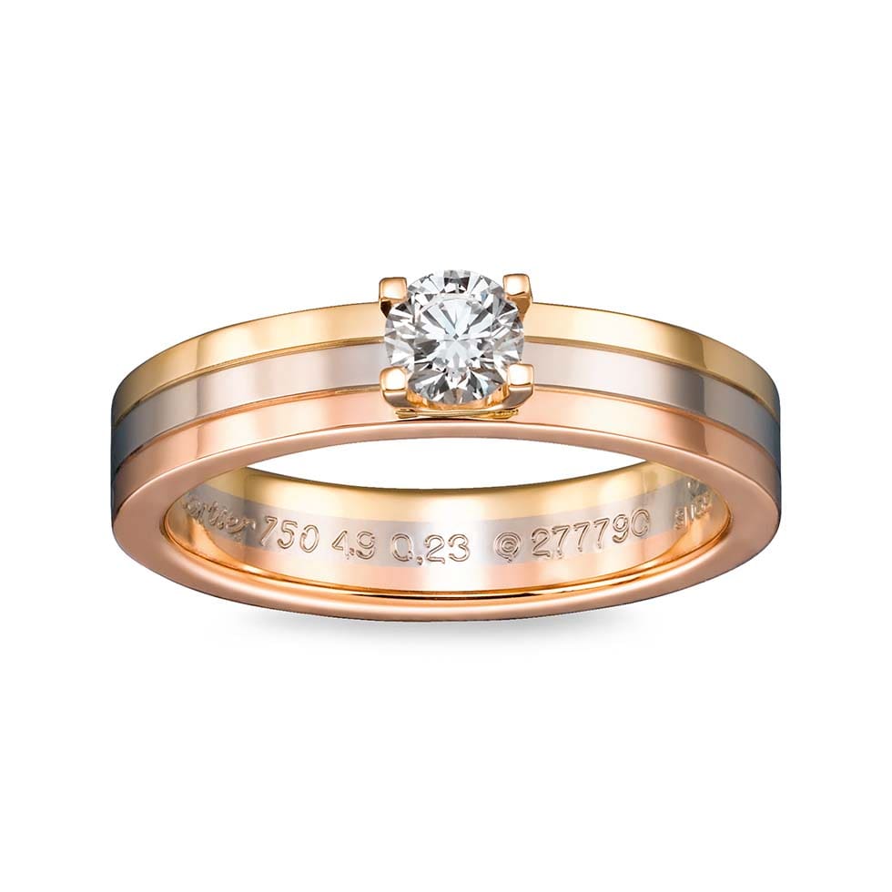Aus silberfarbenem Edelmetall wie zum Beispiel Weißgold, Platin oder Palladium gefertigt, funkelt ein einzelner Brillant in seiner Mitte, weshalb sein Name vom französischen Wort „solitaire“ (Einzelgänger) abgeleitet wurde.