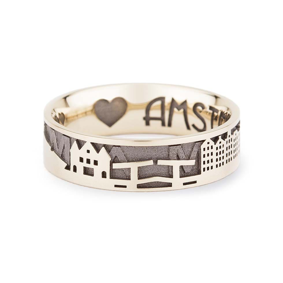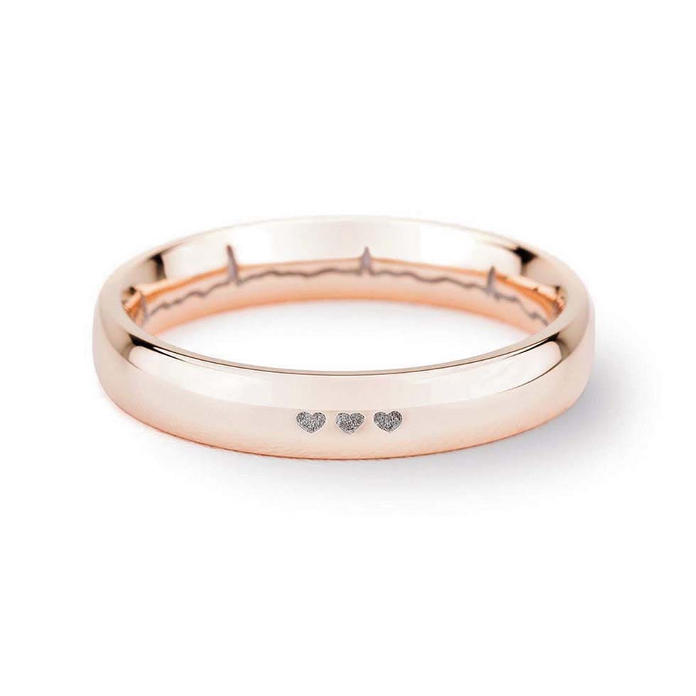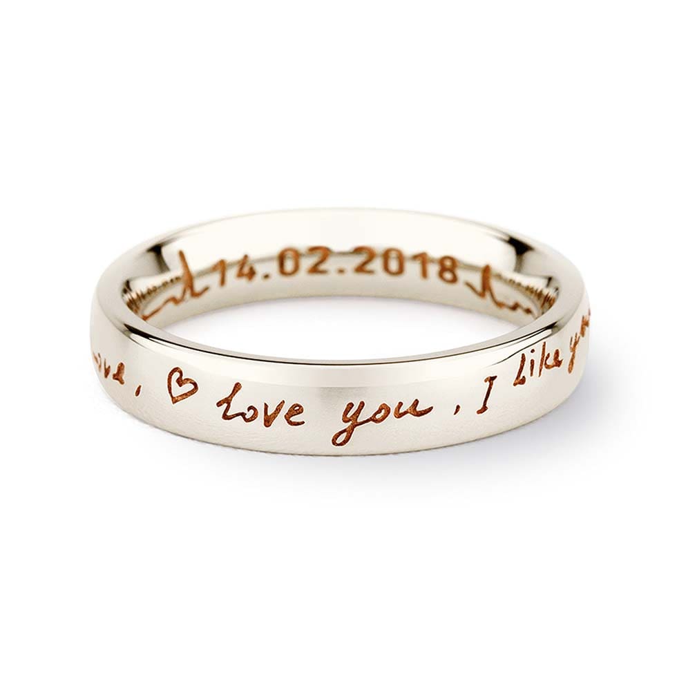 Solche Ringe könnt ihr ganz individuell beim Juwelier selbst gestalten. Einfach die Ringschiene auswählen und mit Text, Herzschlag, eurer Handschrift, einem Abdruck, einem Muster oder Diamanten personalisieren.