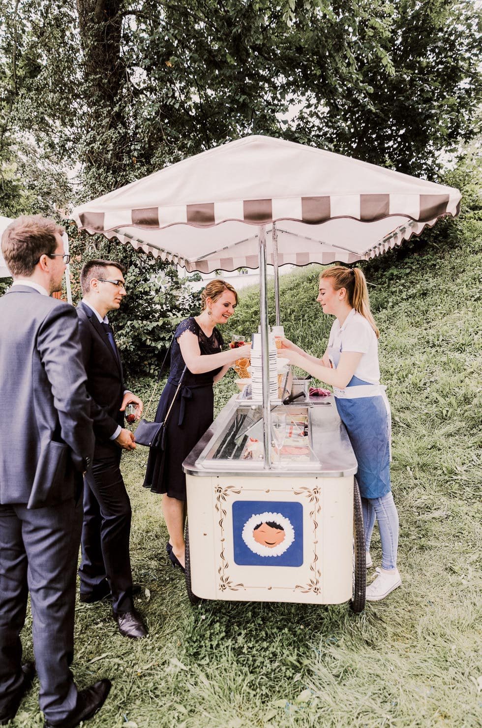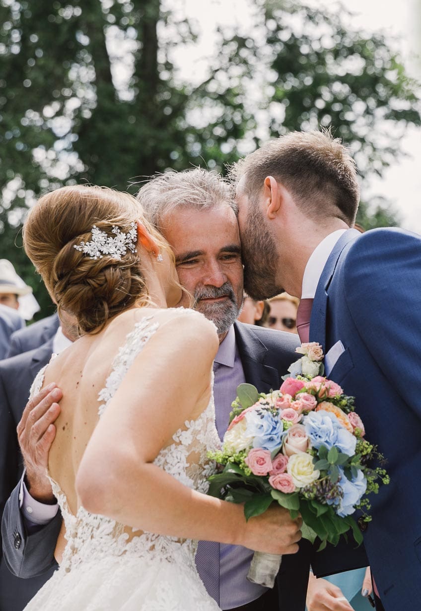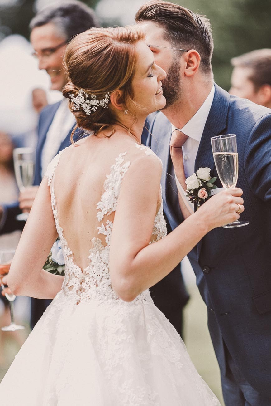 Wichtig war den beiden, dass ihre Gäste immer gut versorgt sind. So gab es für alle während der Trauung Ablaufpläne, weiße Schirme, Papierfächer, Freudentränen-Taschentücher und sogar Absatzschoner für die Damen (bei nasser Wiese oder Kopfsteinpflaster wirklich toll).