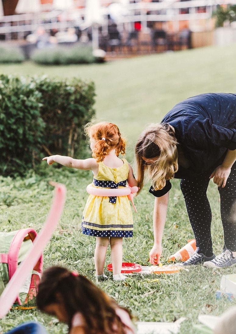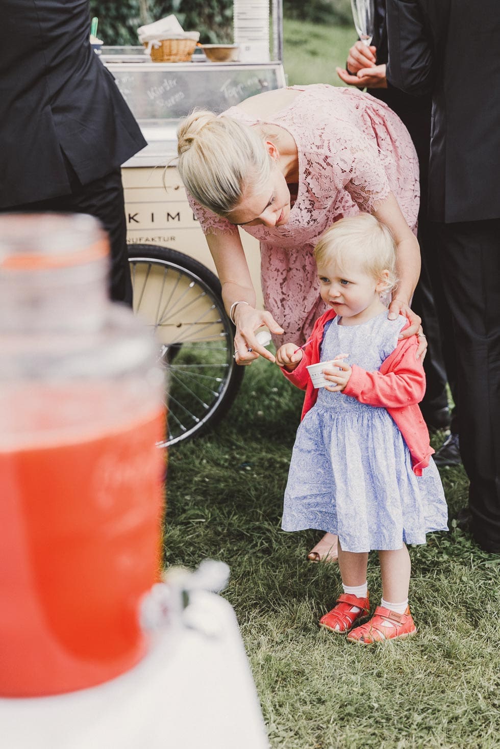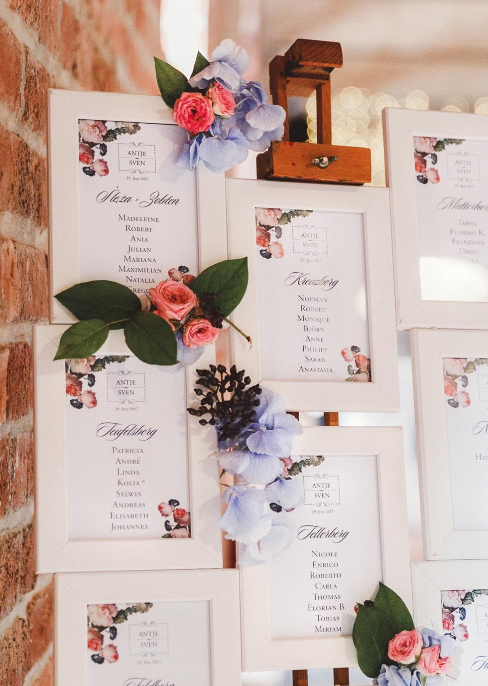 Wichtig war den beiden, dass ihre Gäste immer gut versorgt sind. So gab es für alle während der Trauung Ablaufpläne, weiße Schirme, Papierfächer, Freudentränen-Taschentücher und sogar Absatzschoner für die Damen (bei nasser Wiese oder Kopfsteinpflaster wirklich toll).