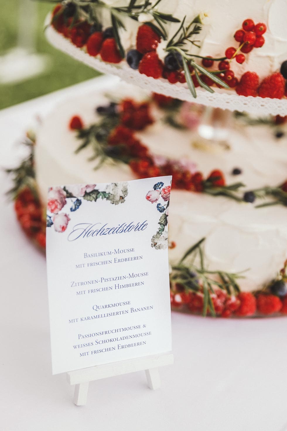 So wollten die beiden beispielsweise keine klassische Fondant-Torte und entschieden sich für eine Cremetorte auf einer Etagere, die mit Beeren dekoriert wurde.