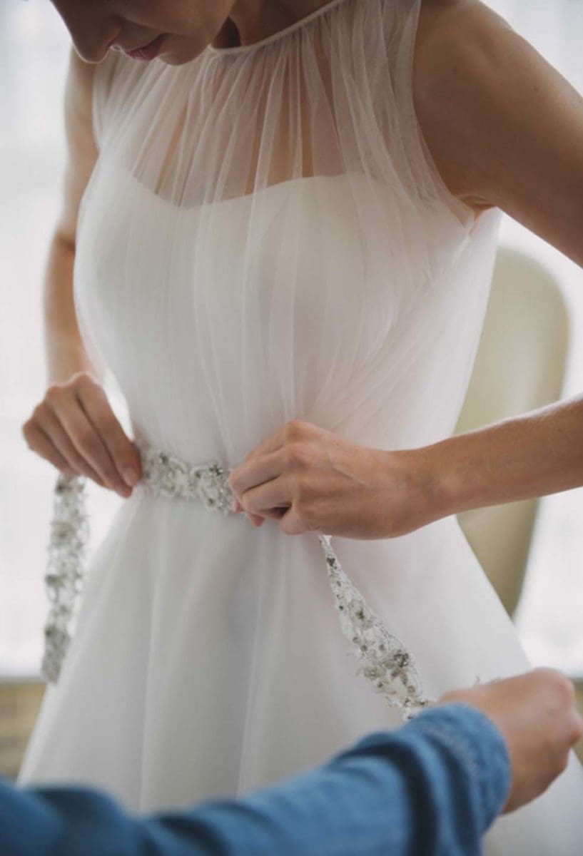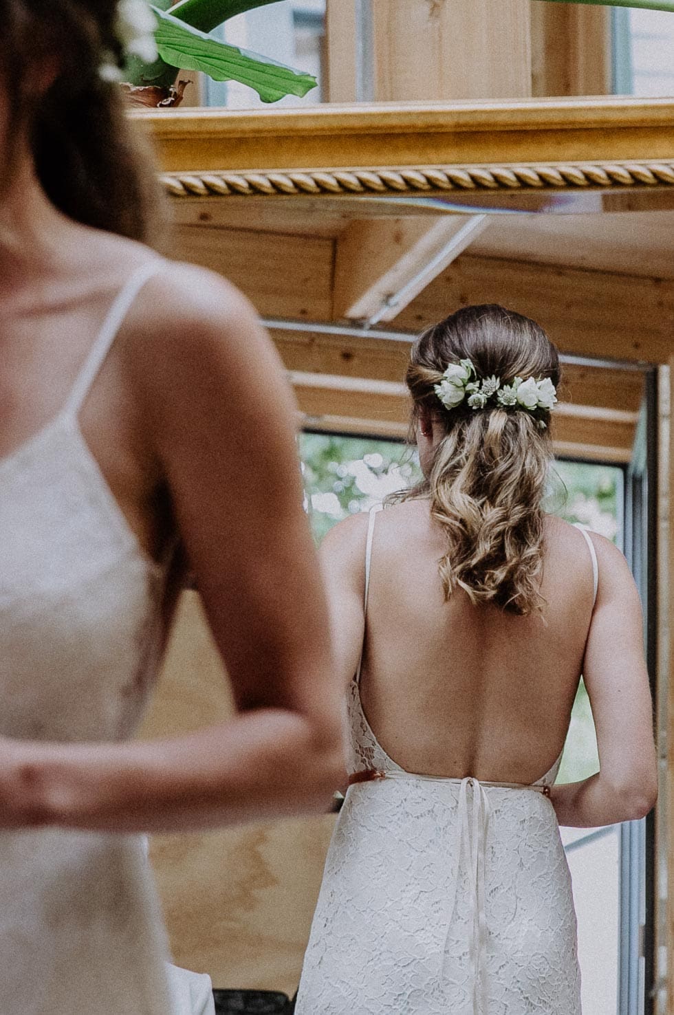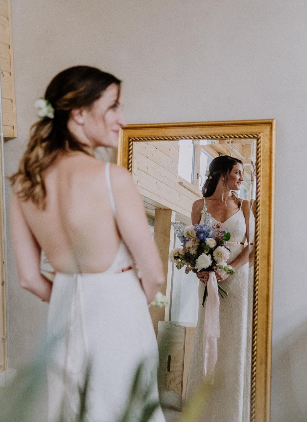 Dazu ist eine herrlich lockere Brautfrisur mit halboffenen Haaren oder einer bezaubernden Hochsteckfrisur perfekt. Schön ist es auch, die Frisur mit frischen Blumen oder einem zarten Haarschmuck zu ergänzen.