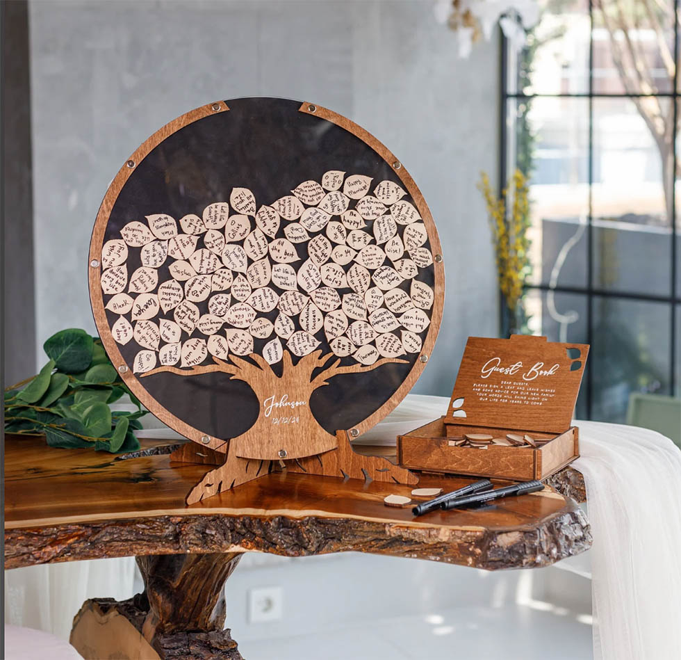 Solche Holz-Gästebücher wirken hochwertig und persönlich zugleich. Und sie sind perfekt für alle, die statt Papier lieber auf natürliche Materialien setzen. Einige Modelle lassen sich sogar mit eurem Namen oder Hochzeitsdatum gravieren – so wird euer Gästebuch Baum zur Hochzeit zu einem echten Familienerbstück.