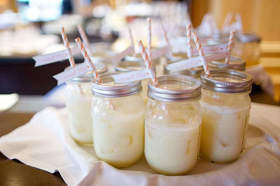 Alle Zutaten gemeinsam mit drei Eiswürfeln mixen (gut ist auch ein Shaker) und in ein mit Crushed Ice gefülltes Glas gießen. Diese Piña Colada kann auch in großen Containern am Hochzeitsmorgen vorgemixt, gekühlt und auf dem Fest auf Crushed Ice gegossen werden.
