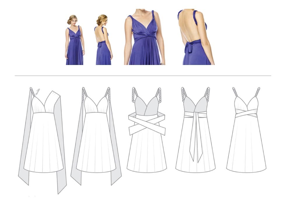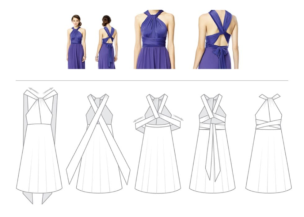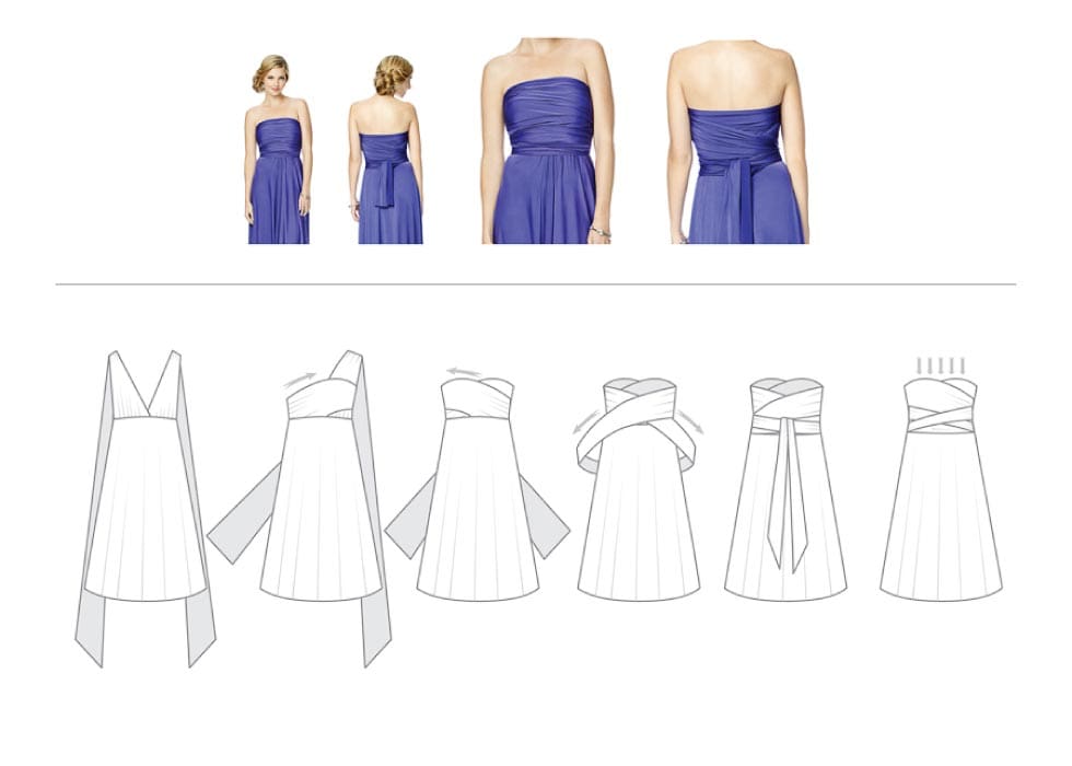 Das Oberteil der Wickelkleider kann in über fünfzehn verschiedenen Arten gebunden werden. Von trägerlos bis V-Ausschnitt ist alles möglich. So kann sich jede Brautjungfer den für sie komfortabelsten Look aussuchen. Unten haben wir euch eine Anleitung ergänzt.