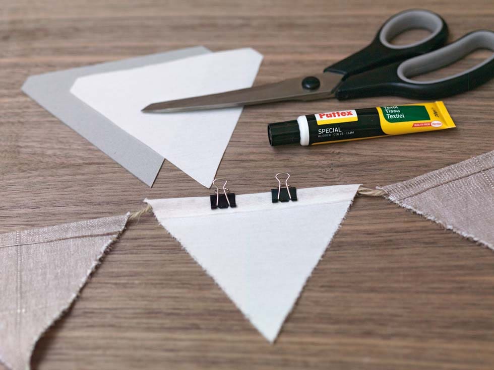 - Wir haben etwas festeres Leinenmaterial verwendet, damit die Dreiecke schön gerade bleiben. Ihr könnt aber auch dünneren Stoff verwenden, der zuvor gestärkt und gebügelt wurde.