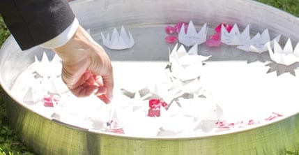 - Anschließend bringt jeder Gast seine Blüte nach vorne und legt sie beispielsweise in eine Zinkwanne, um sie zum Blühen zu bringen.